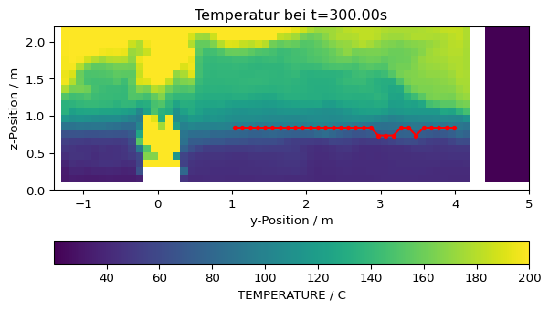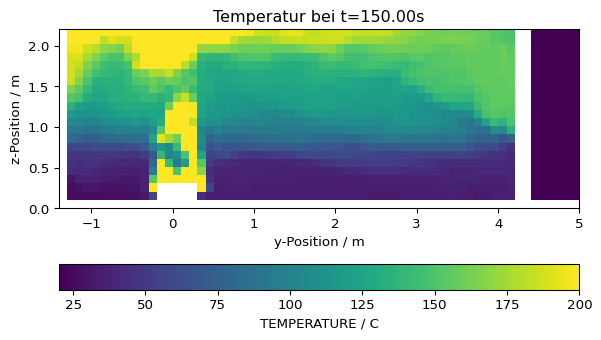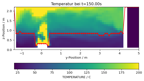 In diesem Beispiel wird die Höhe der Rauchsichtbarkeitsschicht analysiert. Die Unterscheidung erfolgt hier anhand eines einfachen Temperatur-Grenzwerts: Die lokale Schichthöhe ergibt sich aus dem niedrigsten Punkt, an dem eine bestimmte Temperatur überschritten wird. Die Auswertung erfolgt auf einem Slice entlang des Brenners (normal zur x-Achse).