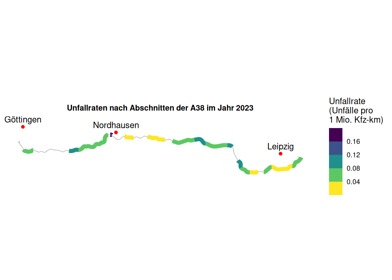 Wir sehen, dass viele Abschnitte eine Unfallkostenrate von unter 15 Euro pro 1000 Kfz und km und Jahr haben. Auffällig ist ein Abschnitt zwischen Nordhausen und Göttigen. Ein Blick in den Datensatz verrät, dass es hier innerhalb der drei beobachteten Jahre 10 schwere und 4 leichte Unfälle auf etwa 6,5 km Länge und bei etwa 22.000 Kfz pro Tag gab.