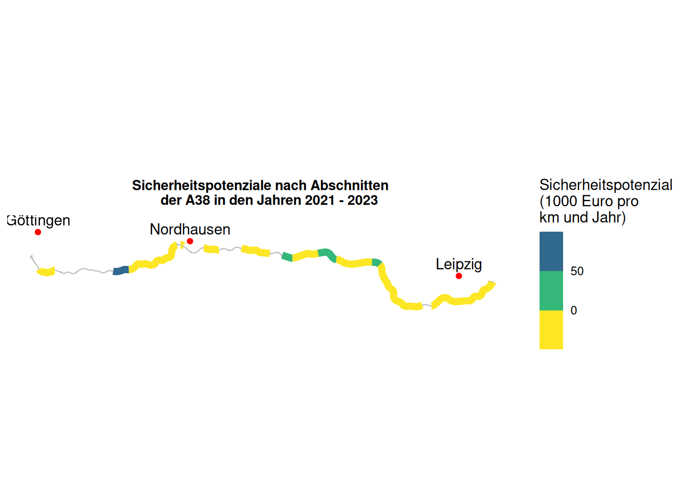 Ein Sicherheitspotenzial, dass kleiner gleich 0 ist, bedeutet, dass die Unfallkostendichte geringer als oder gleich der Grundunfallkostendichte ist. Das heißt, dass hier weniger (schwere) Unfälle aufgetreten sind, als aufgrund des Ausbaus zu erwarten wären. Das ist also etwas positives, hier gibt es (zumindest für den beobachteten Zeitraum) wenig Handlungsdruck. Je größer das Sicherheitspotenzial ist, desto mehr Bedarf besteht, die Infrastruktur sicherer zu gestalten. In unserer Grafik ist das vor allem der Abschnitt zwischen Nordhausen und Göttingen (SIPO zwischen 50 und 100), der schon bei der Unfallkostenrate auffällig war, sowie drei Abschnitte zwischen Nordhausen und Leipzig die ein Sicherheitspotential zwischen 0 und 50 haben.