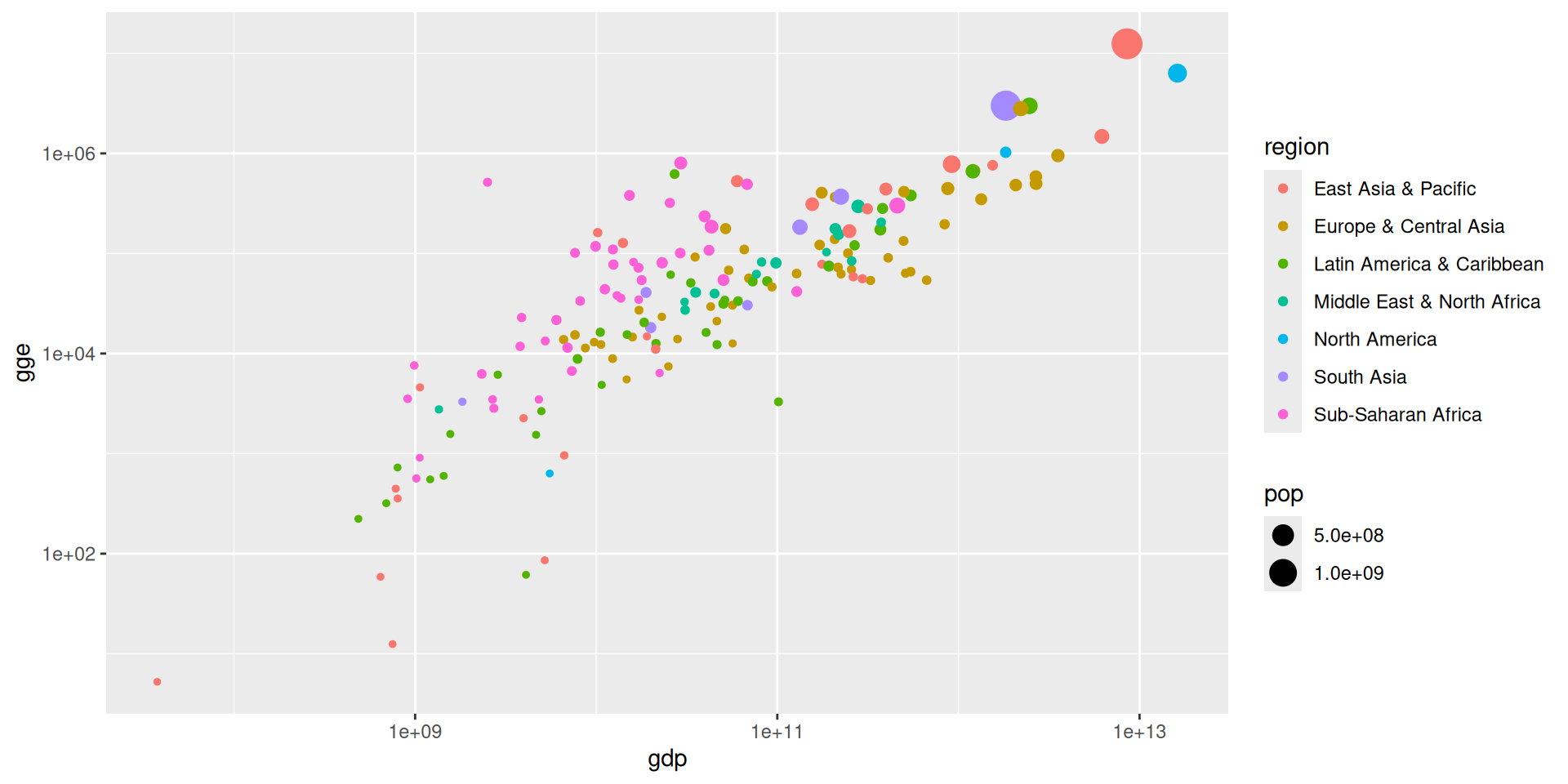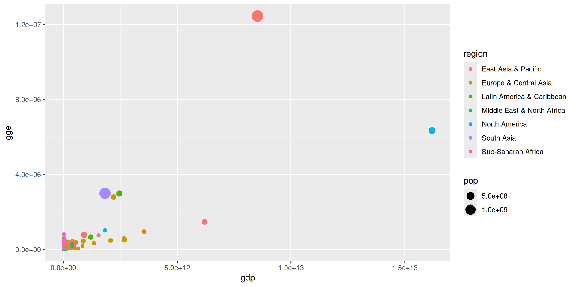 geom_point(mapping = aes(x = gdp, y = gge, fill = region, size = pop), shape = 21) +
