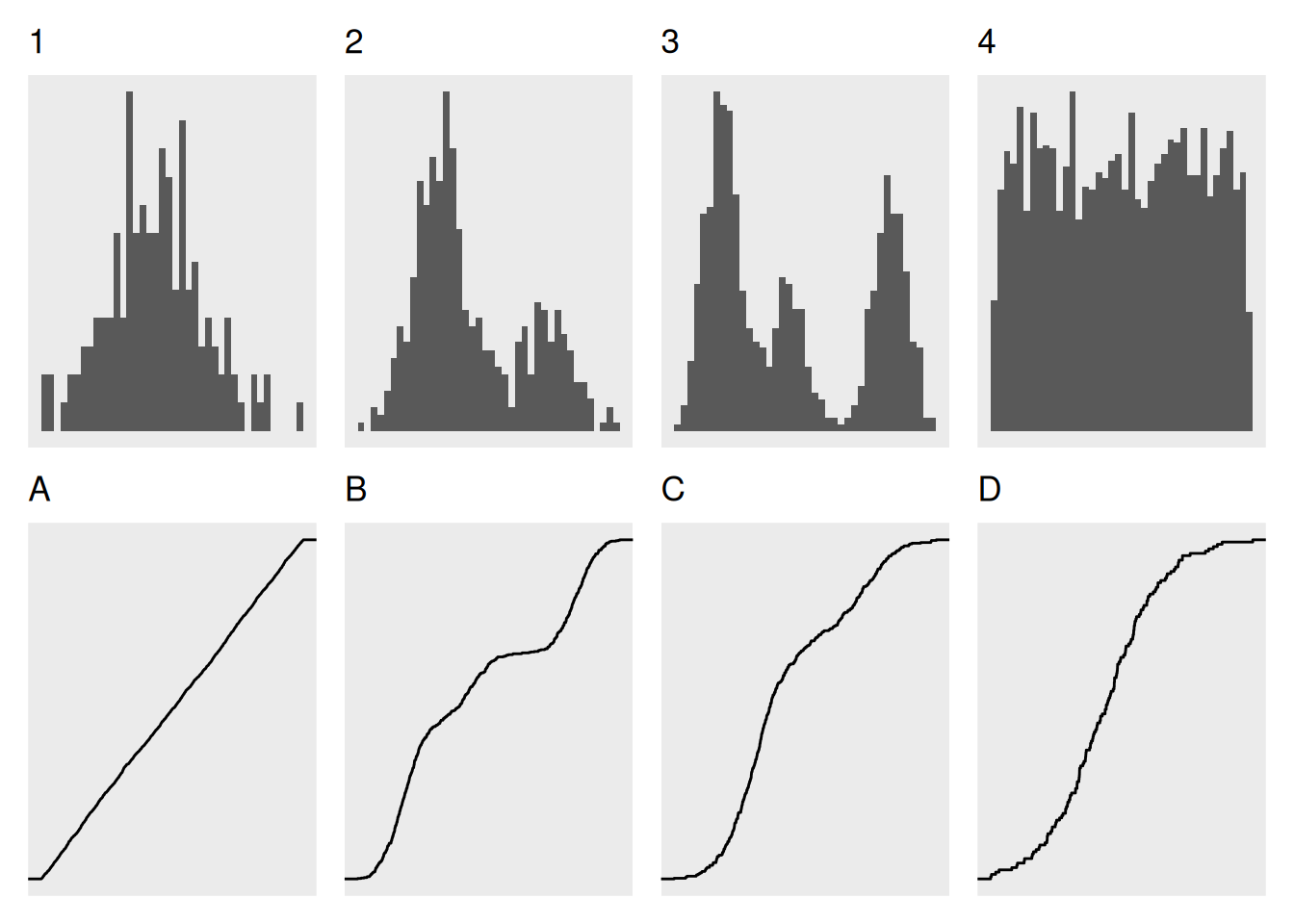 Welche empirische Verteilungsfunktion (A-D) gehört zu welchem Histogramm (1-4)?