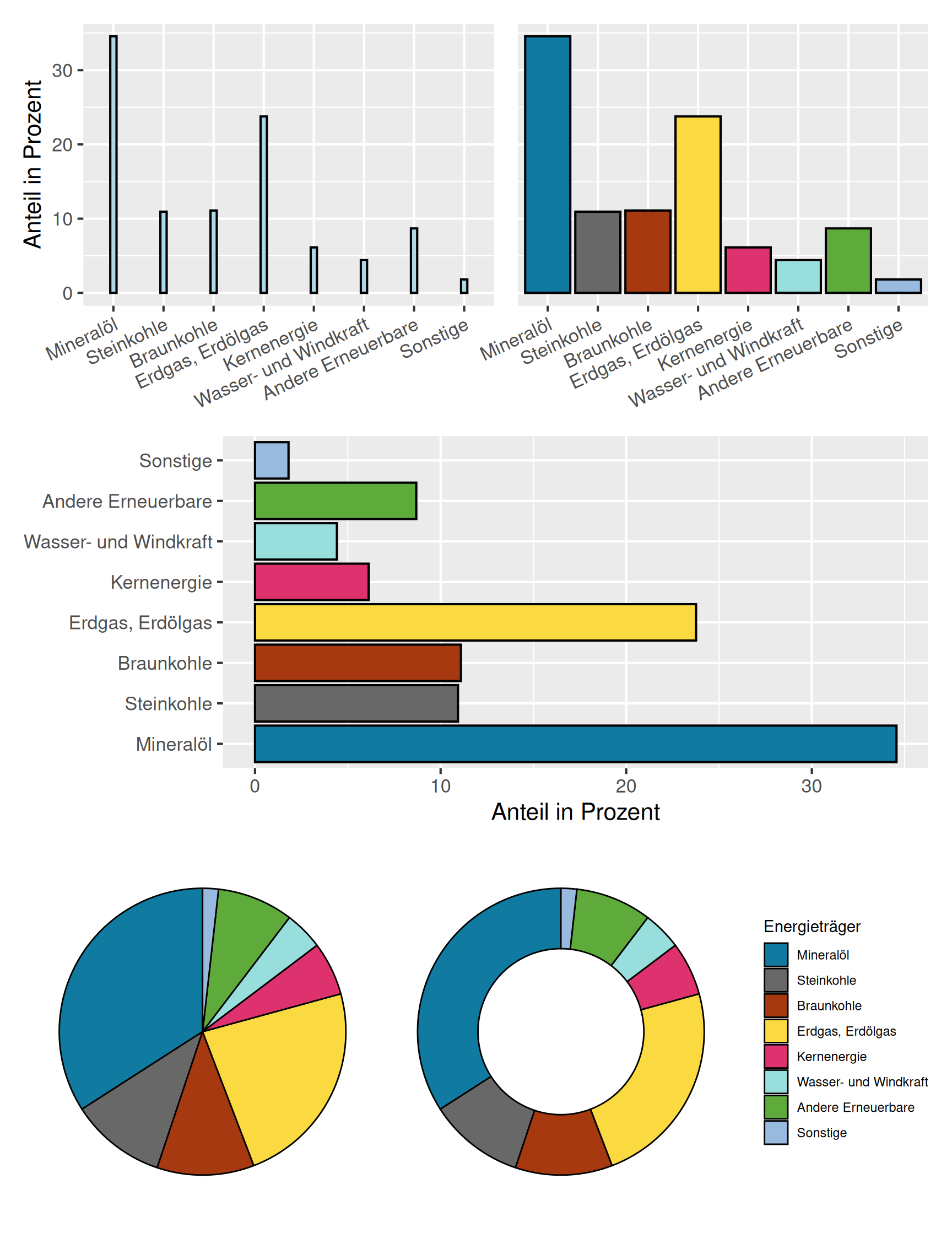 Die Häufigkeitsverteilungen lassen sich natürlich tabellarisch aufbereiten, häufig ist aber eine grafische Darstellung besser geeignet. Die gebräuchlichsten Darstellungsformen sind Stab-, Säulen-, Balken- und Kreisdiagramme. Als Alternative zu Kreisdiagrammen werden häufig auch Ringdiagramme verwendet. In Abbildung 1 sind diese Diagrammtypen beispielhaft dargestellt.