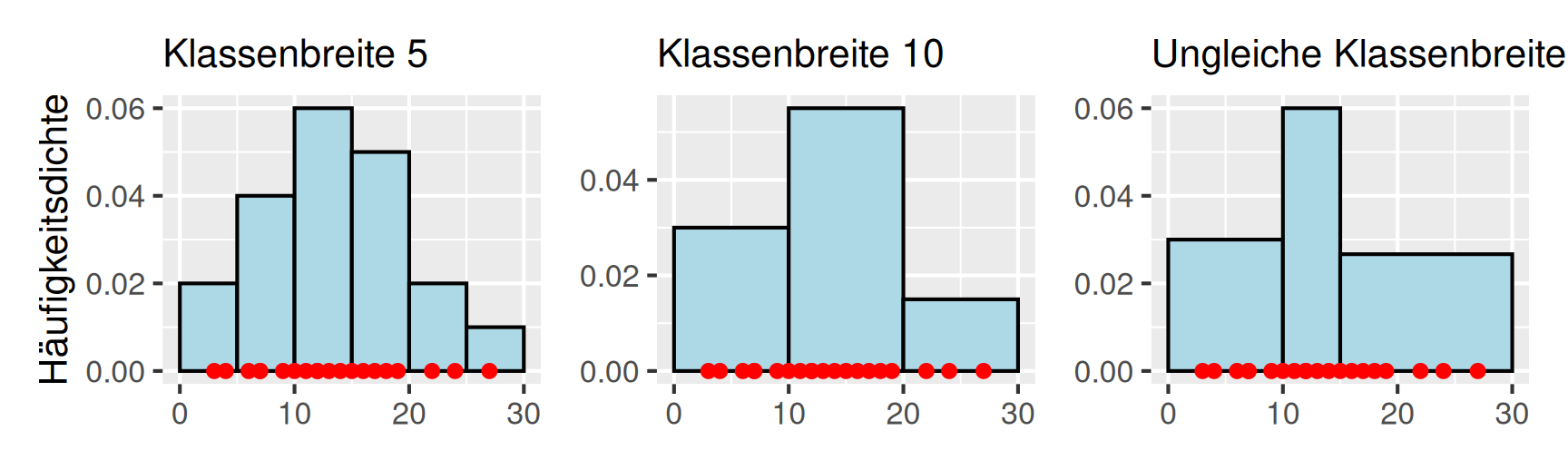 Beispiel Flächentreue: Wir betrachten einen Datensatz \[ x_1 = 3,\; x_2 = 4,\; x_3 = 6, \; \dots \;, x_{20} = 27 \] mit insgesamt \(n = 20\) Beobachtungen. Ein Histogramm teilt den Wertebereich in Klassen (Intervalle) ein und stellt die Häufigkeiten als Balkenflächen dar. Die folgenden drei Histogramme zeigen dieselben Daten mit unterschiedlichen Klasseneinteilungen. Die Punkte am unteren Rand markieren die einzelnen Beobachtungen. Auf der y-Achse ist die Häufigkeitsdichte (= relative Häufigkeit / Klassenbreite) abgetragen.