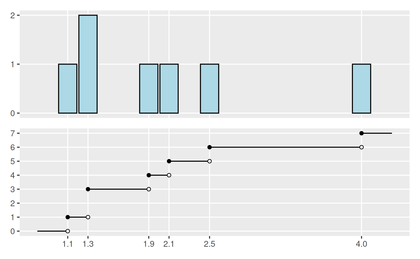 Am Graphen von \(H\) lässt sich nun unmittelbar ablesen, dass es (zum Beispiel) 4 Werte gibt, die kleiner oder gleich 1.9 sind. Gleichzeitig erkennt man, dass die Höhe der Balken in dem oberen Diagramm genau der Höhe der Sprünge im Graphen von \(H\) entspricht.