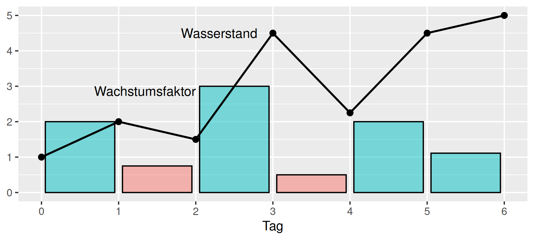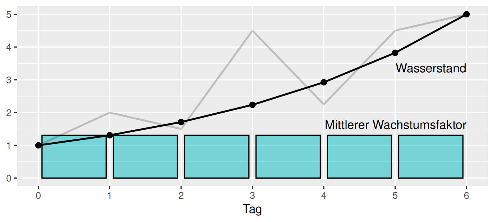 Die Definition des Wachstumsfaktors stellen wir zu \(W_i = x_i W_{j-i}\) um. Mit den Wachstumsfaktoren \(x_i\) und dem Wasserstand \(W_0 = 1\) können wir also den Verlauf des Wasserstandes für die betrachteten Tage folgendermaßen rekonstruieren: \[ \begin{aligned} W_1 & = x_1 \cdot W_0 & = && \,\, 2.00 \cdot 1.0 & = 2.0 & = && x_1 \cdot W_0 \\ W_2 & = x_2 \cdot W_1 & = && 0.75 \cdot 2.0 & = 1.5 & = && x_2 \cdot x_1 \cdot W_0 \\ W_3 & = x_3 \cdot W_2 & = && 3.00 \cdot 1.5 & = 4.5 & = && x_3 \cdot x_2 \cdot x_1 \cdot W_0 \\ &&&&&& \vdots \\ W_6 & = x_6 \cdot W_5 & = && 1.11 \cdot 4.5 & = 5.0 & = && \,\, x_6 \cdot x_5 \cdot x_4 \cdot x_3 \cdot x_2 \cdot x_1 \cdot W_0 \\ \end{aligned} \] Für einen mittleren Wachstumsfaktor \(z\) möchten wir dasselbe Ergebnis erhalten, wenn wir sechs Tage lang diesen Wachstumsfaktor ansetzen. Es muss daher \[ W_6 = z \cdot z \cdot z \cdot z \cdot z \cdot z \cdot W_0 = z^6 \cdot W_0 \] gelten, so dass wir zunächst \[ z^6 \cdot W_0 = x_6 \cdot x_5 \cdot x_4 \cdot x_3 \cdot x_2 \cdot x_1 \cdot W_0 \] und daraus den mittleren Wachstumsfaktor \[ \begin{aligned} z & = \sqrt[6]{x_6 \cdot x_5 \cdot x_4 \cdot x_3 \cdot x_2 \cdot x_1} \\ & = \sqrt[6]{ 2.00 \cdot 0.75 \cdot 3.00 \cdot 0.50 \cdot 2.00 \cdot 1.11} \\ & = \sqrt[6]{5} \\ & = 1.307\dots \end{aligned} \] für den Wasserstand berechnen. Hier nochmals die Situation mit dem mittleren Wachstum.