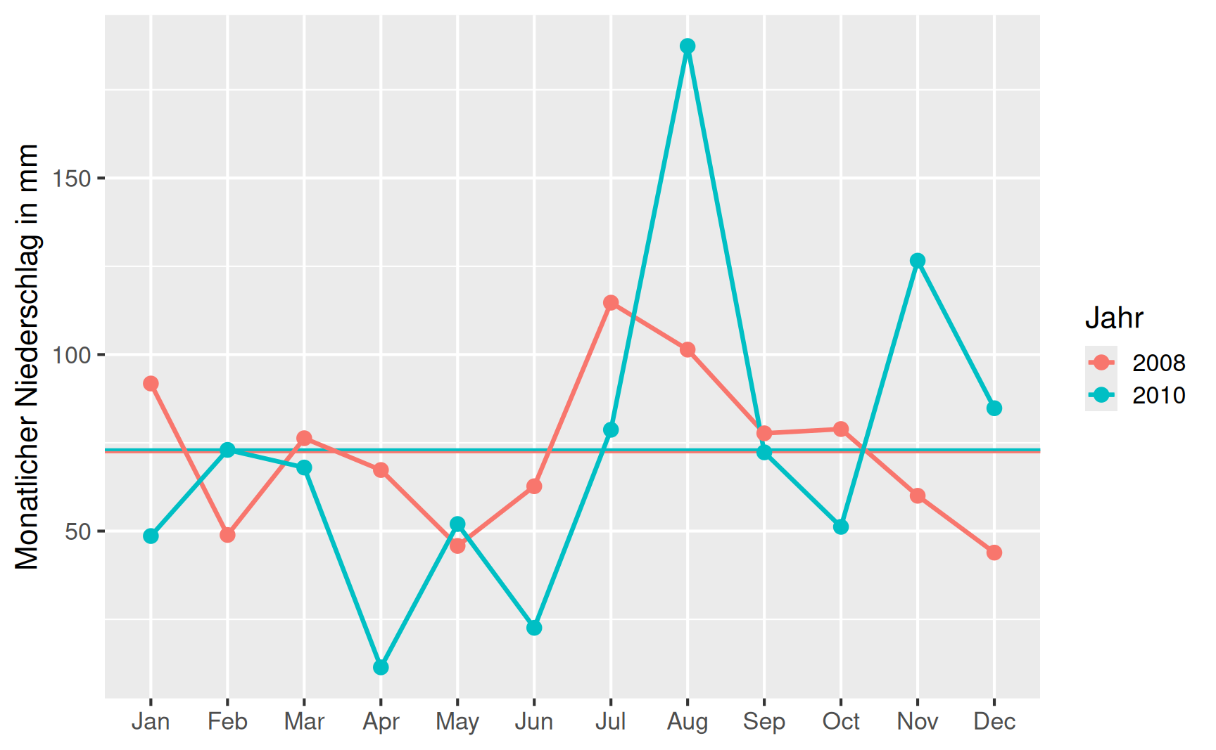 \[ \begin{aligned} \tilde{s}^2_{2008} & = \frac{1}{12}\left(19.35^2 + (-23.55)^2 + \dots + (-28.55)^2 \right) = 453.17\,\mathrm{mm^2} \\[1em] \tilde{s}^2_{2010} & = \frac{1}{12}\left( (-24.45)^2 + (-0.05)^2 + \dots + 11.75^2 \right) = 2000.32\,\mathrm{mm^2} \end{aligned} \] sowie die Standardabweichungen \[ \begin{aligned} \tilde{s}_{2008} & = \sqrt{453.17} = 21.29\,\mathrm{mm} \\[1em] \tilde{s}_{2010} & = \sqrt{2000.32} = 44.7\,\mathrm{mm}. \end{aligned} \] Die unterschiedliche Niederschlagscharakteristik der beiden Jahre kommt in diesen Streuungsmaßen deutlich zum Ausdruck. Die Standardabweichung ist dabei einfacher zu interpretieren, da sie im selben Wertebereich wie die Beobachtungen selber liegen.