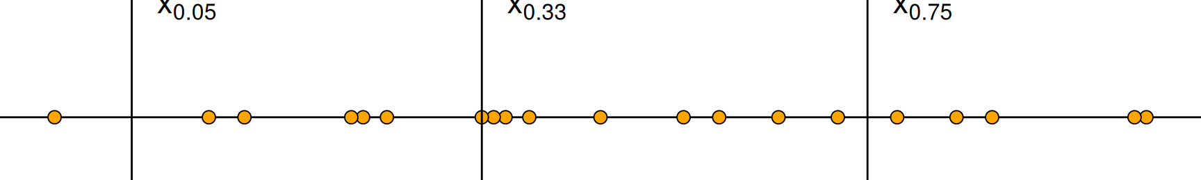 Die Quantile verallgemeinern die Idee des Medians nun dahingehend, dass die Stichprobe in zwei unterschiedlich große Gruppen unterteilt wird. Das \(p\)-Quantil \(x_p\) mit \(0 < p < 1\) trennt die Daten so, dass \(p \cdot 100\,\mathrm{\%}\) der Werte kleiner oder gleich \(x_p\) und \((1 - p) \cdot 100\,\mathrm{\%}\) größer oder gleich \(x_p\) sind.