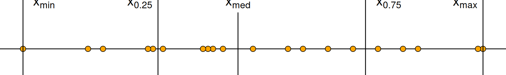 Der Abstand zwischen diesen beiden Werten \[ d_{\mathrm{Q}} = x_{0.75} - x_{0.25} \] heißt Interquartilsabstand. Zusammen mit den Extremwerten und dem Median erhalten wir die Fünf-Punkte-Zusammenfassung einer Verteilung \[ x_{\mathrm{min}}, \; x_{0.25}, \; x_\mathrm{med}, \; x_{0.75}, \; x_{\mathrm{max}}, \] mit der man die Verteilung in vier Bereiche aufteilt, die jeweils ein viertel Werte enthalten. Dabei werden Werte, die auf einem Quartilwert liegen, jeweils mitgezählt. Im Beispiel