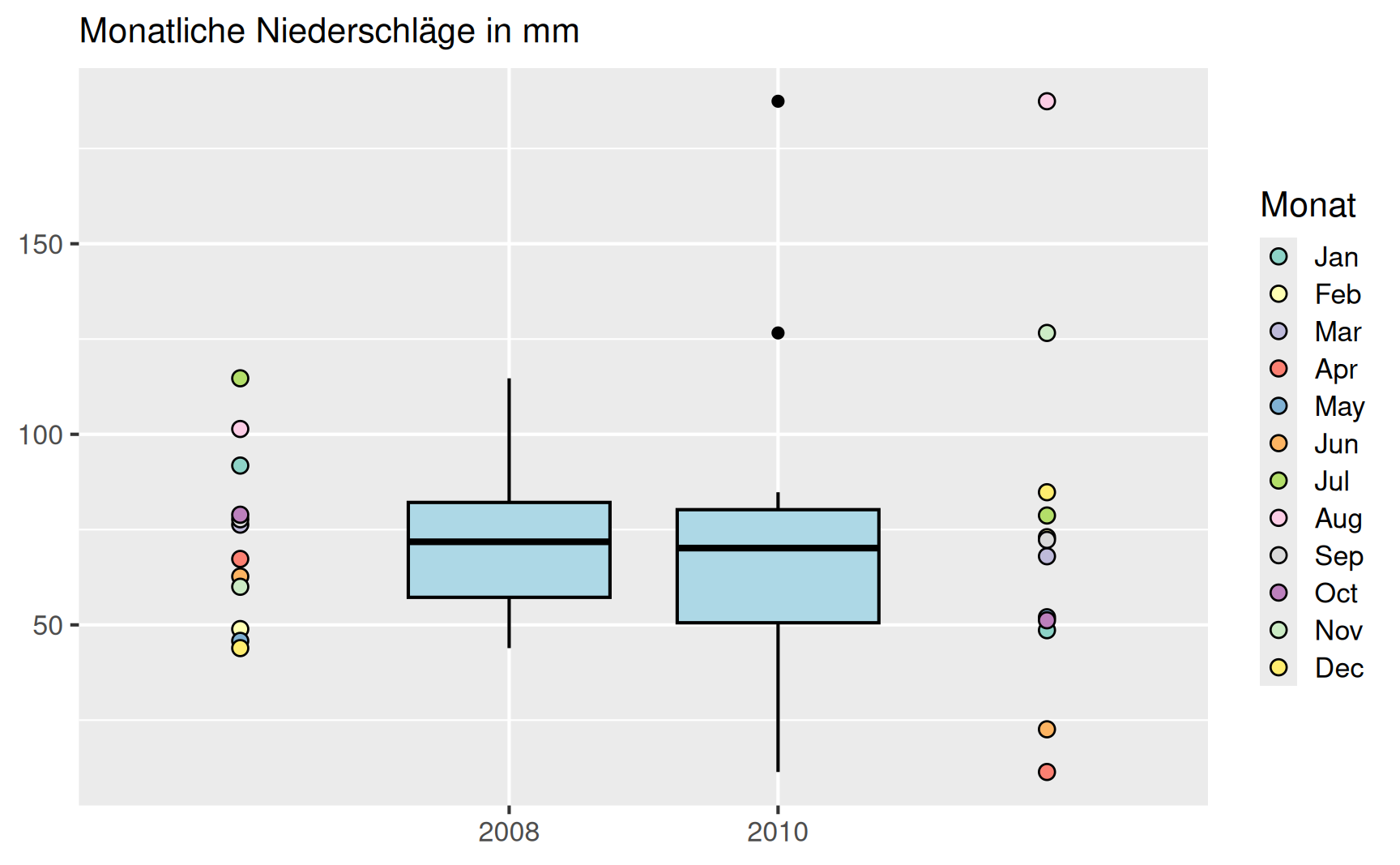 Unten dargestellt sind die Box-Plots der monatlichen Niederschläge in Bochum für die Jahre 2008 und 2010. Um zu verdeutlichen, wie die Box-Plots entstehen, sind seitlich jeweils noch die Niederschlagsmengen für die einzelnen Monate als Punkte dargestellt.