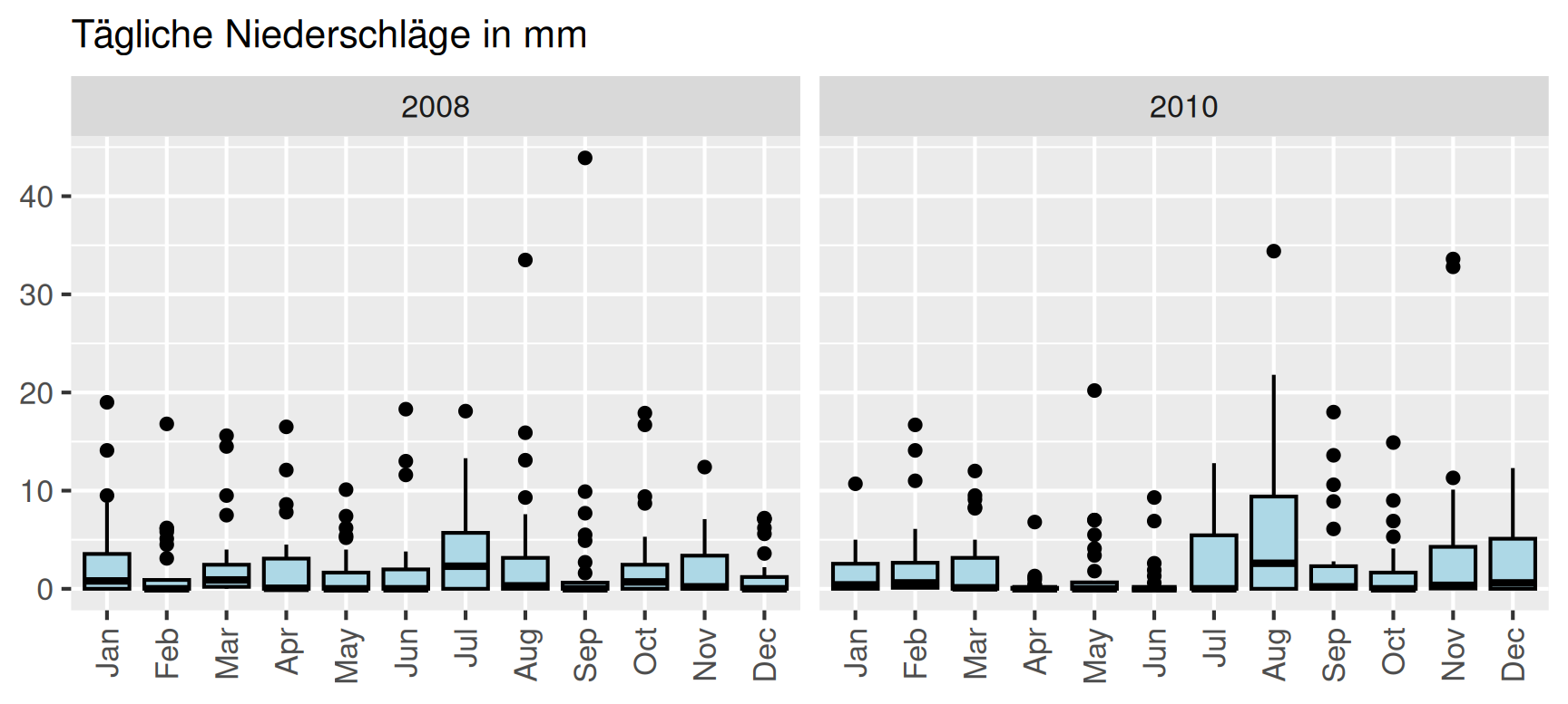 Einen genaueren Einblick in die Niederschläge der beiden Jahre erhalten wir auf Grundlage der täglichen Niederschläge. Die Charakteristik jedes Monats lässt sich dann wieder kompakt in einem Box-Plot zusammenfassen.