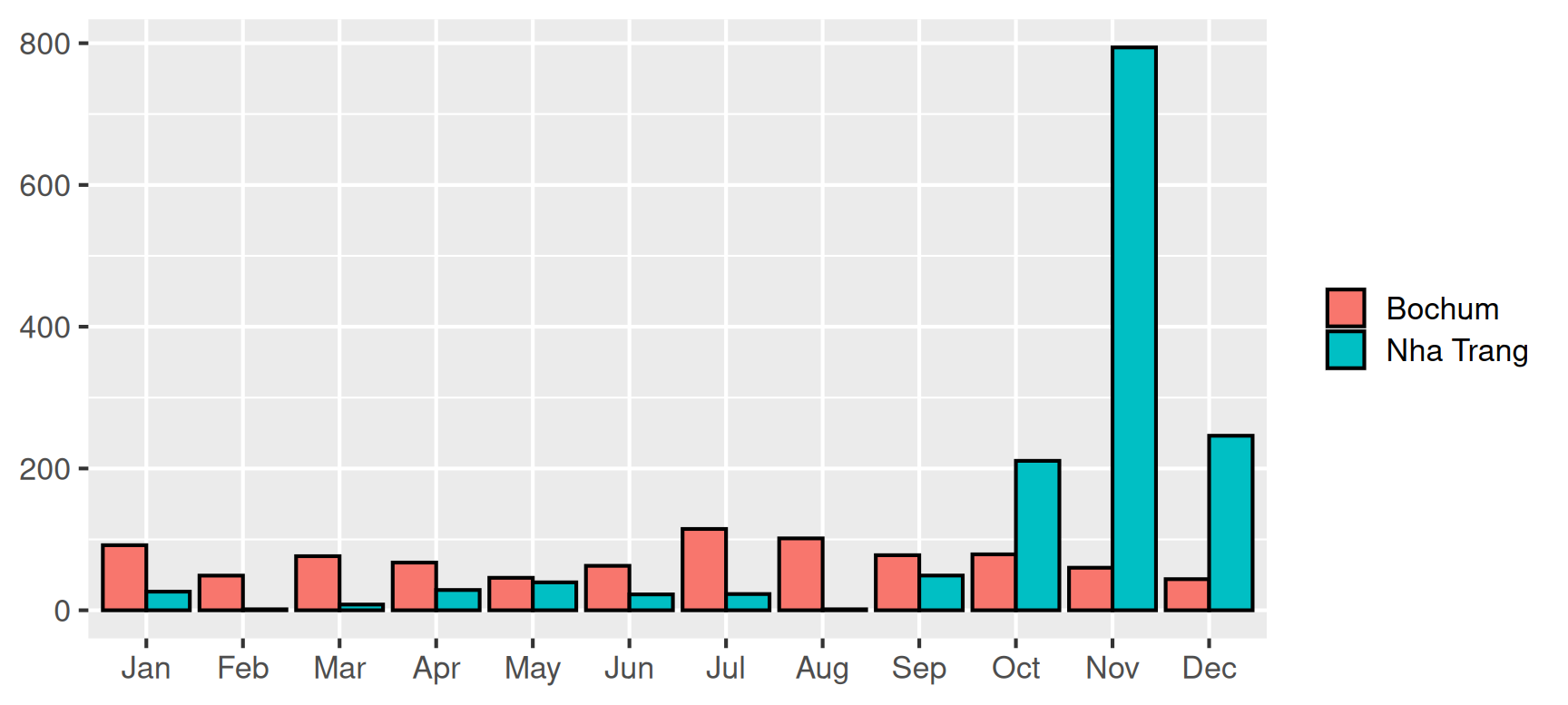 Für die Niederschläge in Bochum und Nha Trang erhalten wir mit den sortierten Monatswerten