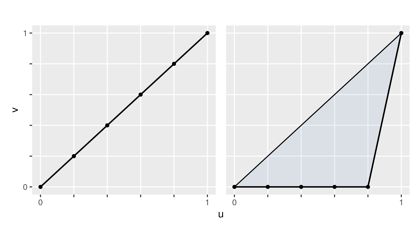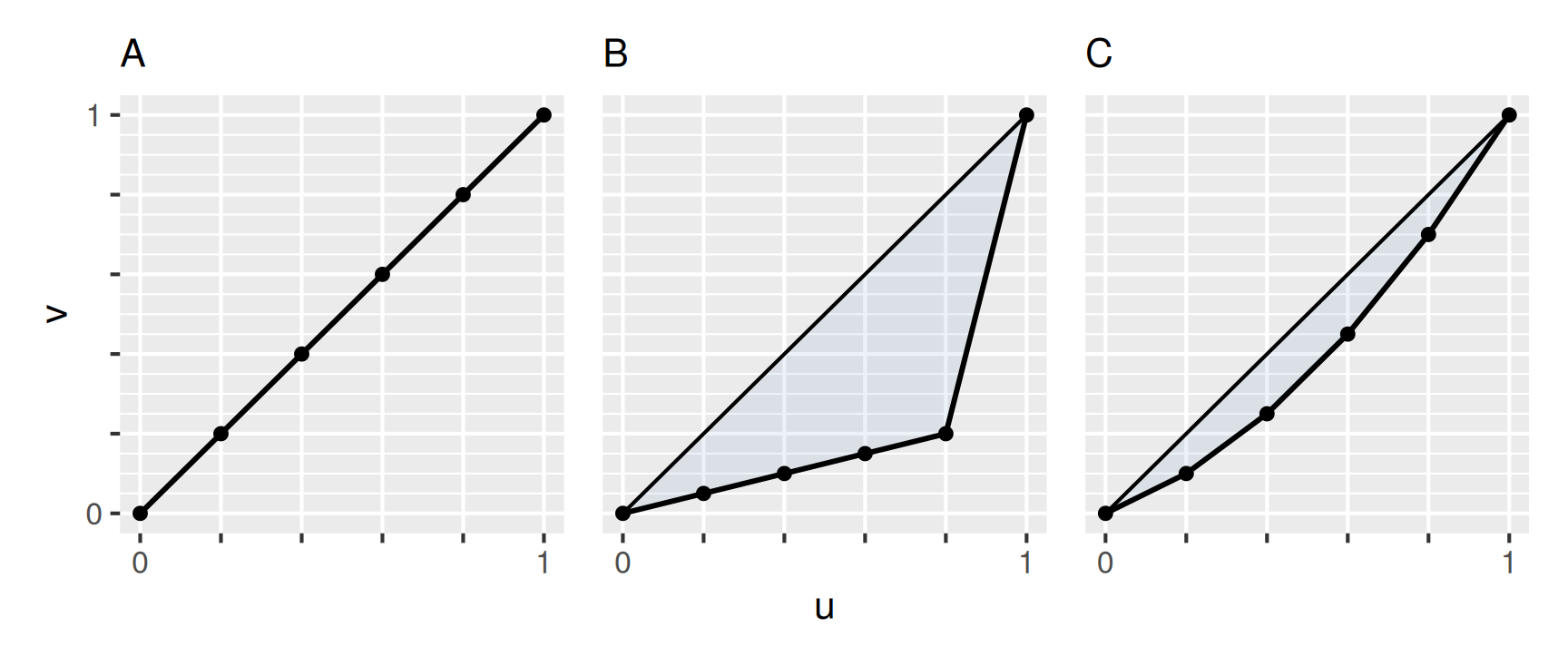 In der Lorenzkurve wird dargestellt, wie viel jeder einzelne Wert einer Stichprobe zur Summe der Werte beiträgt. Dabei werden die Beiträge ihrer Größe nach geordnet und in dieser Reihenfolge in einem \(uv\)-Koordinatensystem aufgetragen. Die Lorenzkurve verbindet diese Punkte zu einem Polygonzug. Um zu einer Darstellung zu gelangen, die nicht von der Anzahl der Beobachtungen und der Größe der Werte abhängt, werden die Daten in den Bereich von 0 bis 1 skaliert. Das folgende Beispiel illustriert die Vorgehensweise.