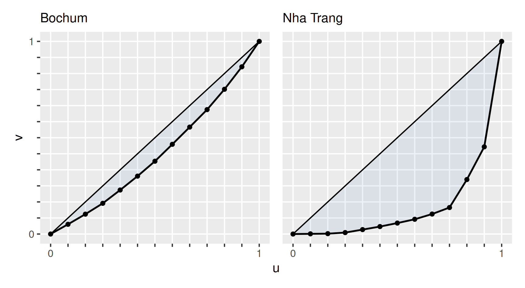 Für die Jahresniederschläge aus dem einleitenden Beispiel erhalten wir die Zahlenwerte der normierten Gini-Koeffizienten für \[ \begin{aligned} \text{Bochum:} \quad G^* = 0.18, \\ \text{Nha Trang:} \quad G^* = 0.79. \end{aligned} \] Hier ist an einer Zahl unmittelbar zu erkennen, dass die Niederschläge in Bochum sehr viel gleichmäßiger über das Jahr verteilt gefallen sind als in Nha Trang.