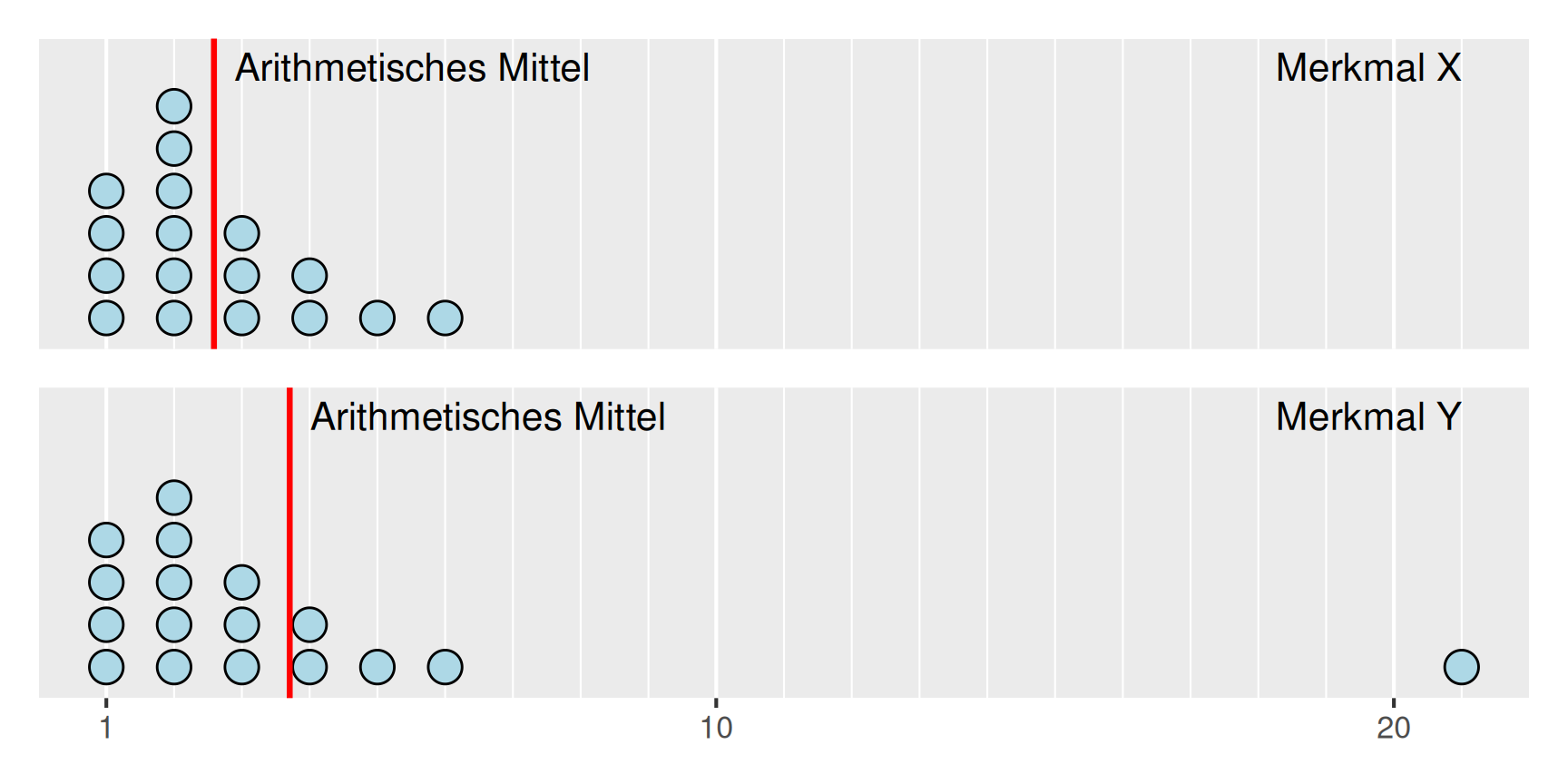 Obwohl sich die beiden Datensätze nur in einem Wert unterscheiden, weichen die arithmetischen Mittelwerte \[ \begin{aligned} \bar{x} & = \frac{1}{17}(1 + 2 + 6 + \dots + \phantom{1}2 + \dots + 2) = 2.588\dots \\[1em] \bar{y} & = \frac{1}{17}(1 + 2 + 6 + \dots + 21 + \dots + 2) = 3.705\dots \end{aligned} \] deutlich voneinander ab, was auch an der graphischen Darstellung gut ablesbar ist.