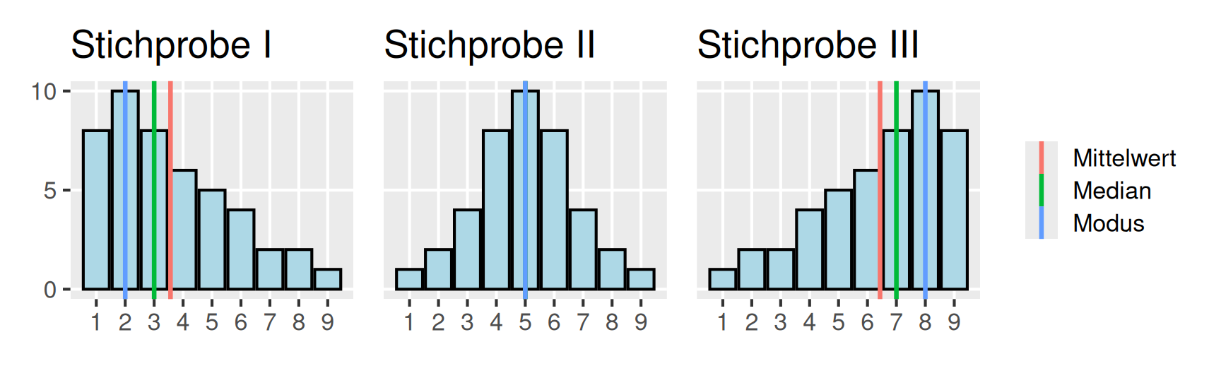 Beispiel Lageregeln: Wir betrachten drei Verteilungen, für die bereits die drei oben besprochenen Lagemaße bestimmt wurden.