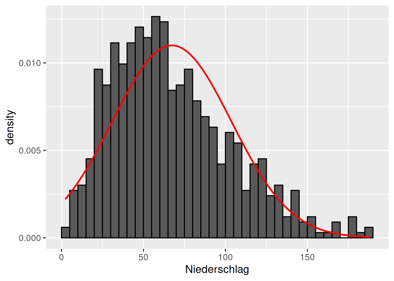 geom_density(mapping = aes(x = Niederschlag), color = 'red', linewidth = 1) +