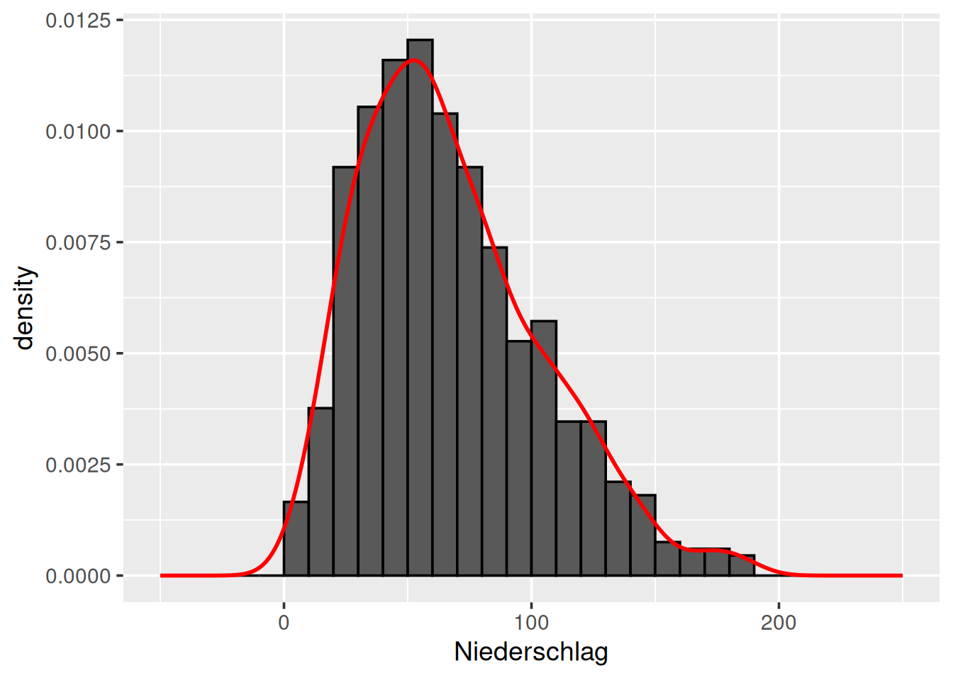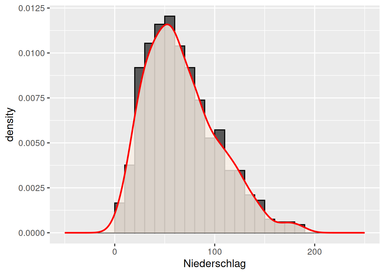 geom_density(mapping = aes(x = Niederschlag), bw = 8, linewidth = 1, color = 'red') +