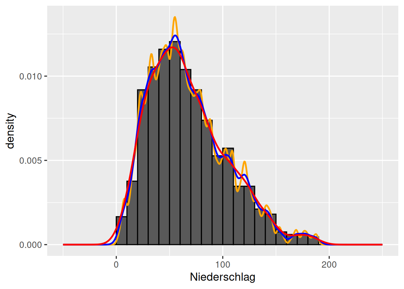 geom_density(mapping = aes(x = Niederschlag), bw = 2, linewidth = 1, color = 'orange') +