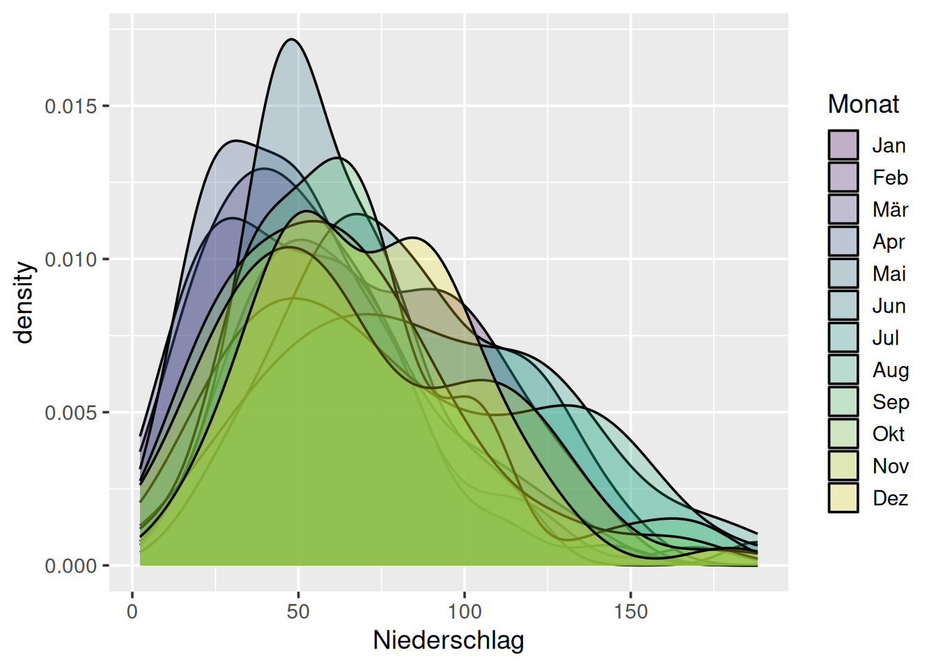 geom_density(mapping = aes(x = Niederschlag, fill = Monat), alpha = 1/4)