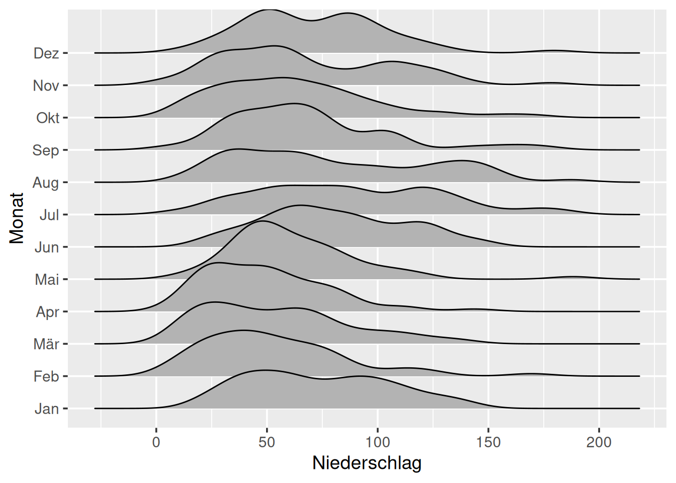 geom_density_ridges(mapping = aes(x = Niederschlag, y = Monat), bandwidth = 10)
