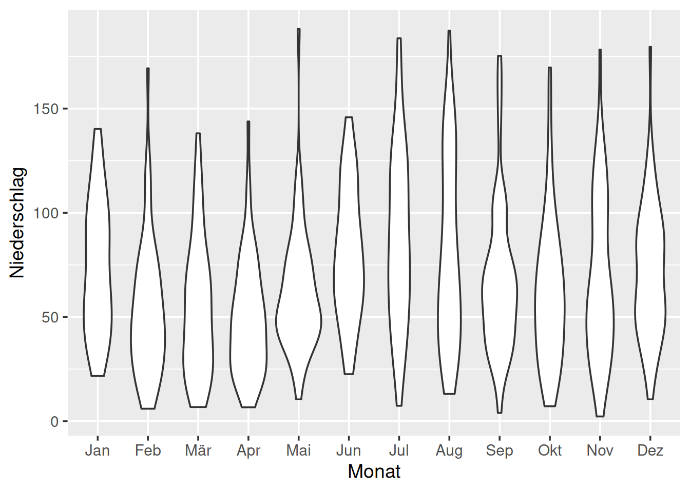 geom_violin(mapping = aes(x = Monat, y = Niederschlag))