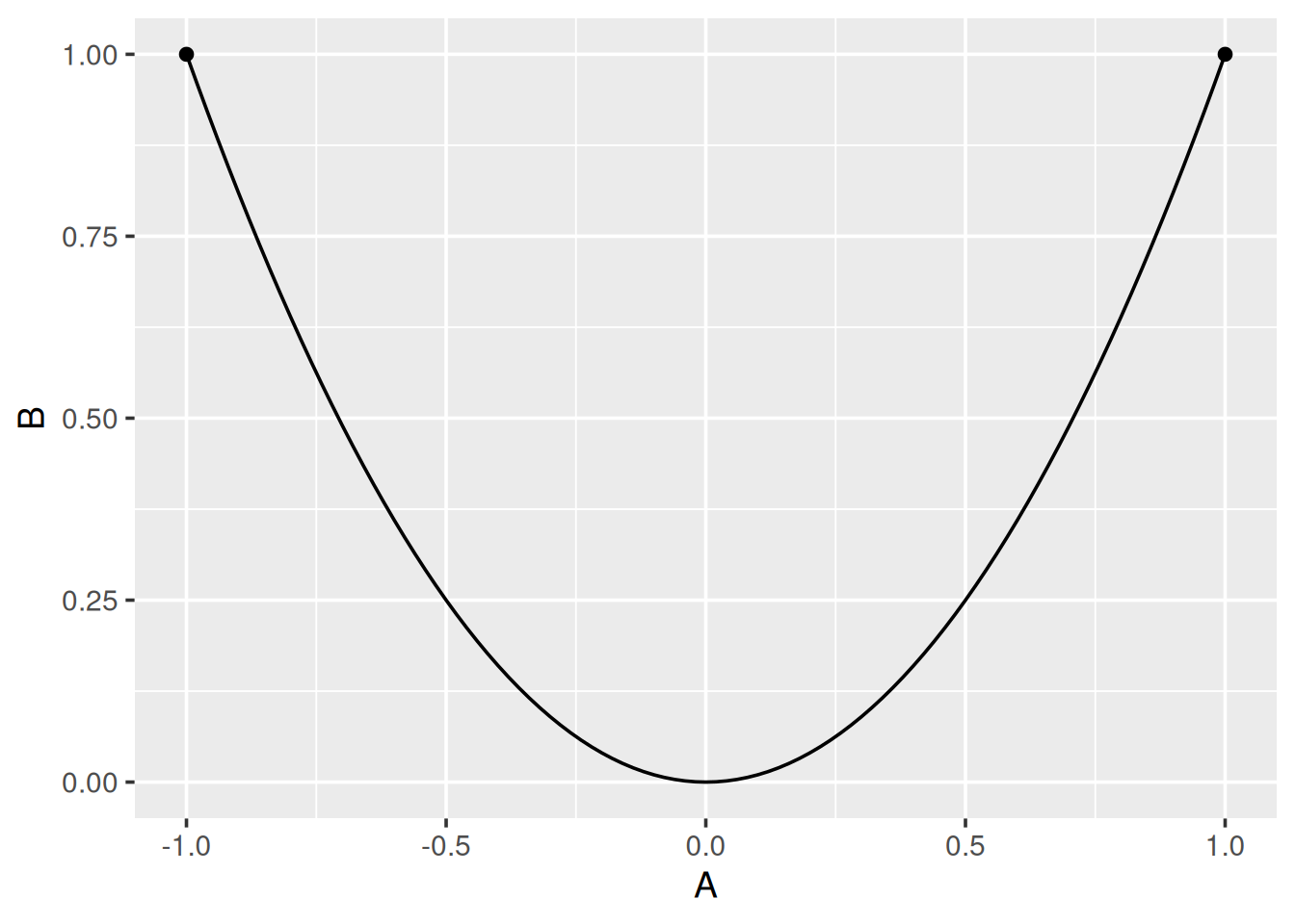 ggplot(data = tibble(A = c(-1, 1), B = c(1, 1))) +