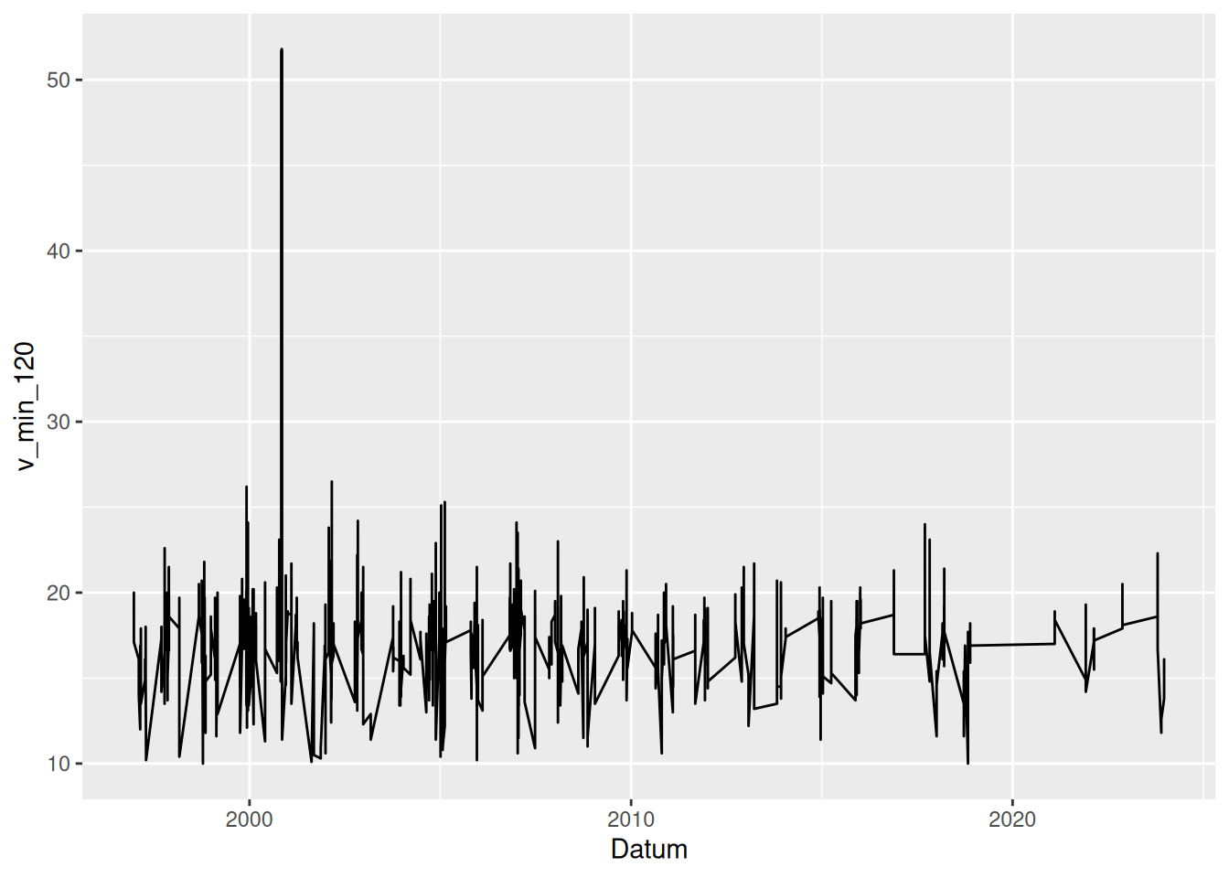 filter(v_min_120 >= 10, v_max_120 >= 20)Funktionen roll_minr und roll_maxr suchen aus n = 12 Werten (aktuell und 11 vorangegangene) kleinsten und größten Wert heraus. Analog für Summe, Mittelwert und so weiter.