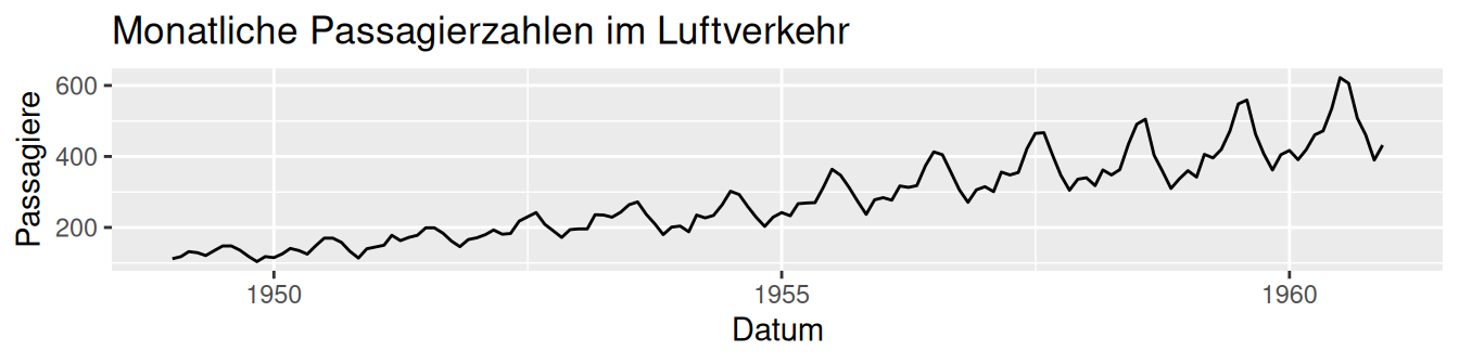 Die einzelnen Zeitpunkte werden zu einer Menge von Beobachtungszeitpunkten \(T\) zusammengefasst, bei der für jeden Zeitpunkt \(t \in T\) genau eine Beobachtung vorliegt. Zeitreihen treten in fast allen Bereichen der Wissenschaft auf.
