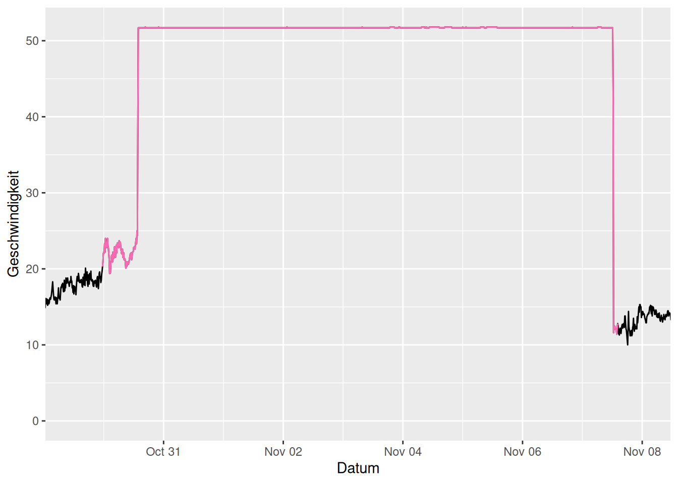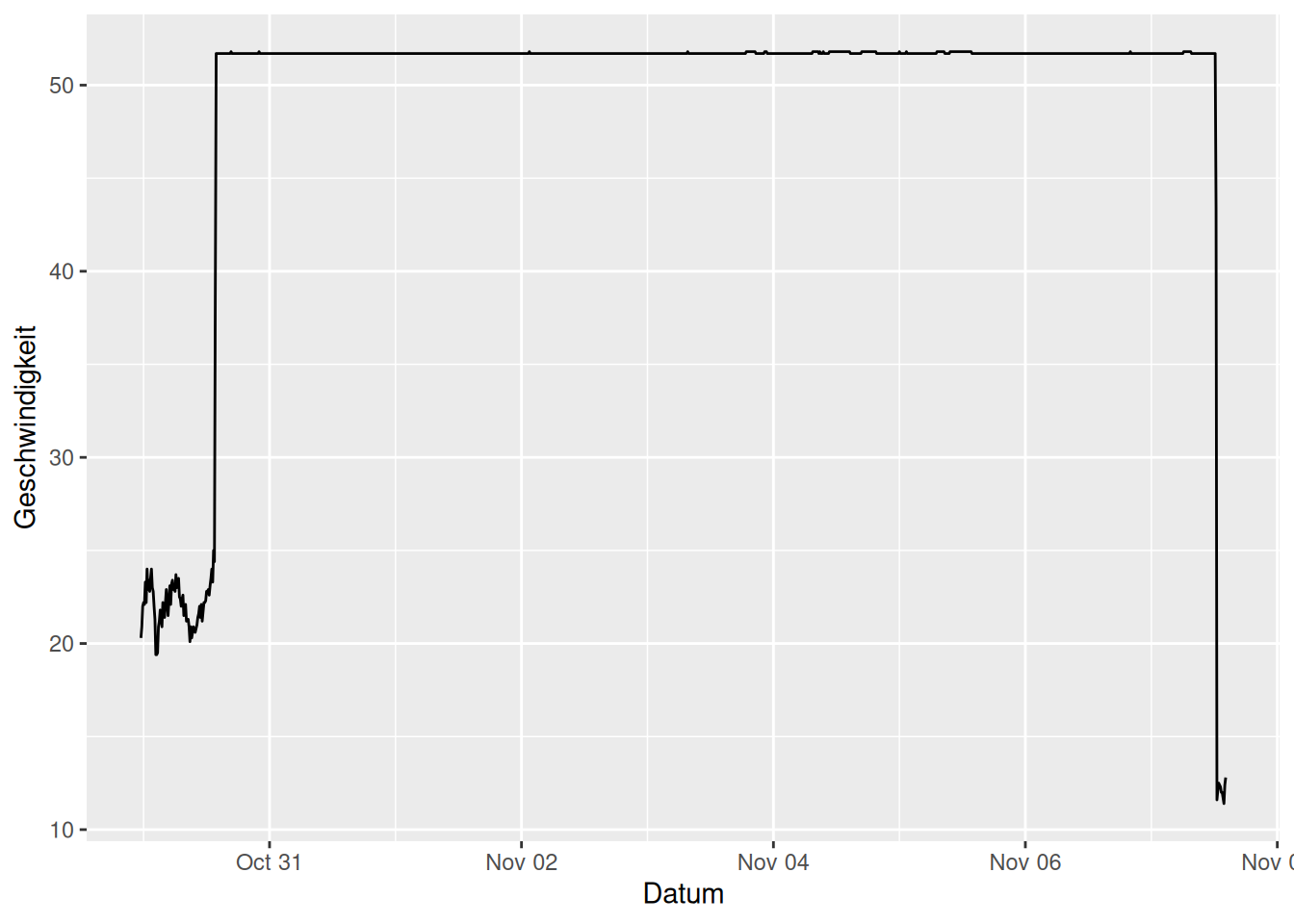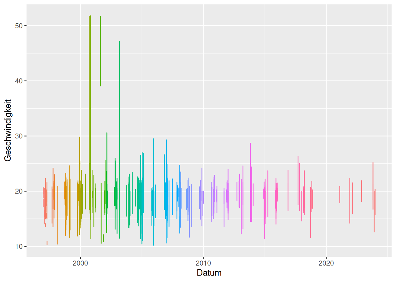 geom_line(mapping = aes(x = Datum, y = Geschwindigkeit, group = gruppe, color = factor(gruppe)), show.legend = FALSE)
