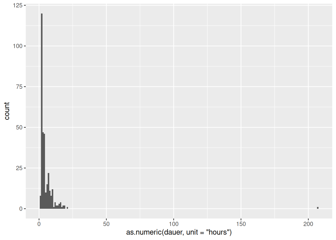 geom_histogram(mapping = aes(x = as.numeric(dauer, unit = "hours")), binwidth = 1)