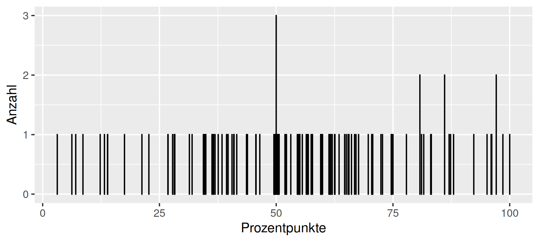 Es ist zu erkennen, dass einzelne Werte zwei- oder dreimal vorkommen und dass es eine Häufung um \(50\%\) herum gibt. Darüber hinaus ist das Diagramm nicht informativ.