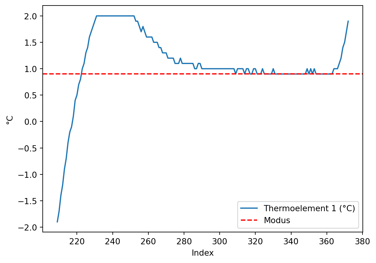# Thermoelement 1## Messwerte grob um den gesuchten Wert 0 °C eingrenzenmaske1 = klimaschrank['Thermoelement 1 (°C)'].le(gesuchter_wert +2) # le = kleiner gleichmaske2 = klimaschrank['Thermoelement 1 (°C)'].ge(gesuchter_wert -2) # ge = größer gleich## häufigster Wert im eingegrenzten Temperaturbereichmodus_bereich = klimaschrank.loc[maske1 * maske2, 'Thermoelement 1 (°C)'].value_counts().idxmax()## Nullpunktfehler bestimmennullpunktfehler = modus_bereich - gesuchter_wertprint(f"Nullpunktfehler: {nullpunktfehler}")## plottenklimaschrank.loc[maske1 * maske2, 'Thermoelement 1 (°C)'].plot()plt.axhline(y = modus_bereich, color ='r', linestyle ='--', label ='Modus')plt.xlabel(xlabel ='Index')plt.ylabel(ylabel ='°C')plt.legend()plt.show()