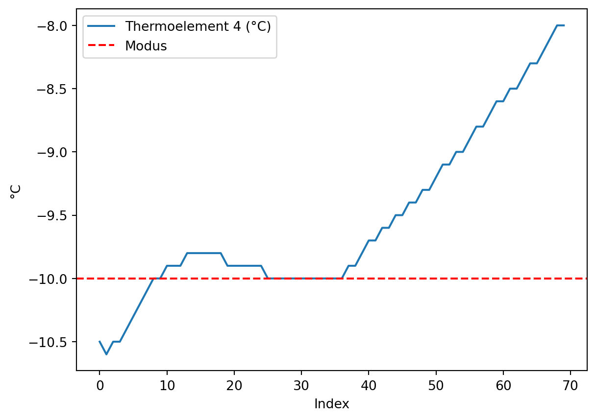 # Thermoelement 4gesuchter_wert =-10## Messwerte grob um den gesuchten Wert 0 °C eingrenzenmaske1 = klimaschrank['Thermoelement 4 (°C)'].le(gesuchter_wert +2) # le = kleiner gleichmaske2 = klimaschrank['Thermoelement 4 (°C)'].ge(gesuchter_wert -2) # ge = größer gleich## häufigster Wert im eingegrenzten Temperaturbereichmodus_bereich = klimaschrank.loc[maske1 * maske2, 'Thermoelement 4 (°C)'].value_counts().idxmax()## Nullpunktfehler bestimmennullpunktfehler = modus_bereich - gesuchter_wertprint(f"Nullpunktfehler: {nullpunktfehler}")## plottenklimaschrank.loc[maske1 * maske2, 'Thermoelement 4 (°C)'].plot()plt.axhline(y = modus_bereich, color ='r', linestyle ='--', label ='Modus')plt.xlabel(xlabel ='Index')plt.ylabel(ylabel ='°C')plt.legend()plt.show()