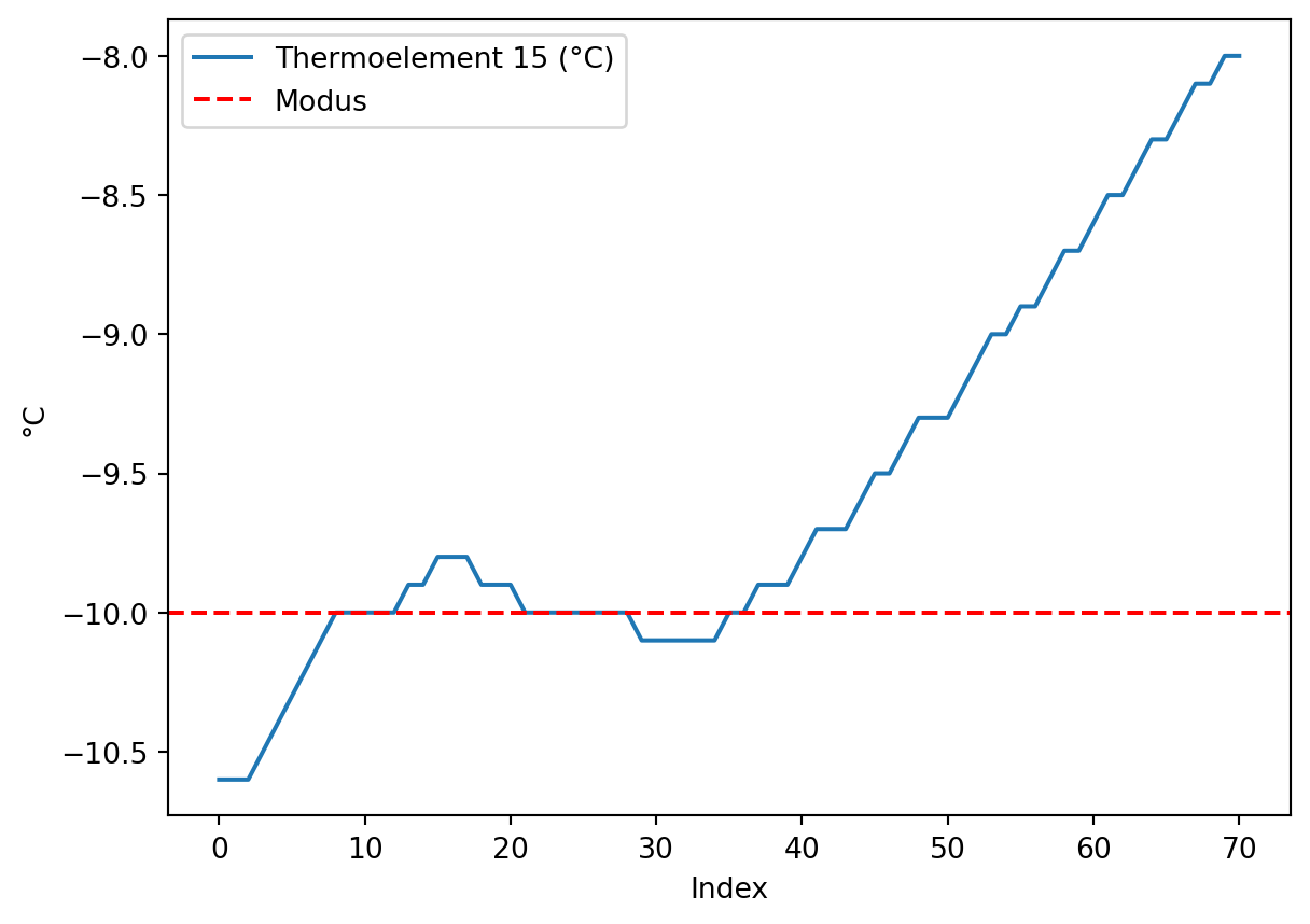 # Thermoelement 15gesuchter_wert =-10## Messwerte grob um den gesuchten Wert 0 °C eingrenzenmaske1 = klimaschrank['Thermoelement 15 (°C)'].le(gesuchter_wert +2) # le = kleiner gleichmaske2 = klimaschrank['Thermoelement 15 (°C)'].ge(gesuchter_wert -2) # ge = größer gleich## häufigster Wert im eingegrenzten Temperaturbereichmodus_bereich = klimaschrank.loc[maske1 * maske2, 'Thermoelement 15 (°C)'].value_counts().idxmax()## Nullpunktfehler bestimmennullpunktfehler = modus_bereich - gesuchter_wertprint(f"Nullpunktfehler: {nullpunktfehler}")## plottenklimaschrank.loc[maske1 * maske2, 'Thermoelement 15 (°C)'].plot()plt.axhline(y = modus_bereich, color ='r', linestyle ='--', label ='Modus')plt.xlabel(xlabel ='Index')plt.ylabel(ylabel ='°C')plt.legend()plt.show()
