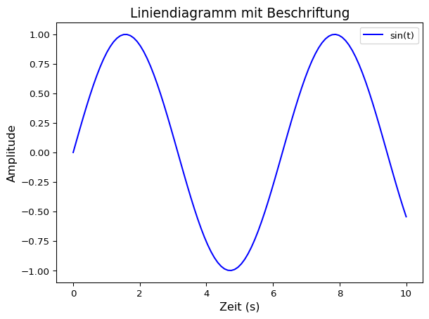 import matplotlib.pyplot as pltimport numpy as npt = np.linspace(0, 10, 100)y = np.sin(t)plt.plot(t, y, label='sin(t)', color='b')plt.xlabel('Zeit (s)', fontsize=12)plt.ylabel('Amplitude', fontsize=12)plt.title('Liniendiagramm mit Beschriftung', fontsize=14)plt.legend()plt.show()