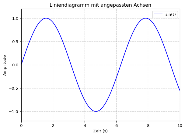 plt.plot(t, y, label='sin(t)', color='b')plt.xlabel('Zeit (s)')plt.ylabel('Amplitude')plt.xlim(0, 10)plt.ylim(-1.2, 1.2)plt.grid(True, linestyle='--', alpha=0.7)plt.title('Liniendiagramm mit angepassten Achsen')plt.legend()plt.show()
