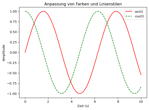 plt.plot(t, np.sin(t), linestyle='-', color='r', label='sin(t)')plt.plot(t, np.cos(t), linestyle='--', color='g', label='cos(t)')plt.xlabel('Zeit (s)')plt.ylabel('Amplitude')plt.title('Anpassung von Farben und Linienstilen')plt.legend()plt.show()