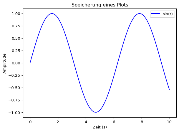 plt.plot(t, y, label='sin(t)', color='b')plt.xlabel('Zeit (s)')plt.ylabel('Amplitude')plt.title('Speicherung eines Plots')plt.legend()plt.savefig('mein_plot.png', dpi=300)plt.show()